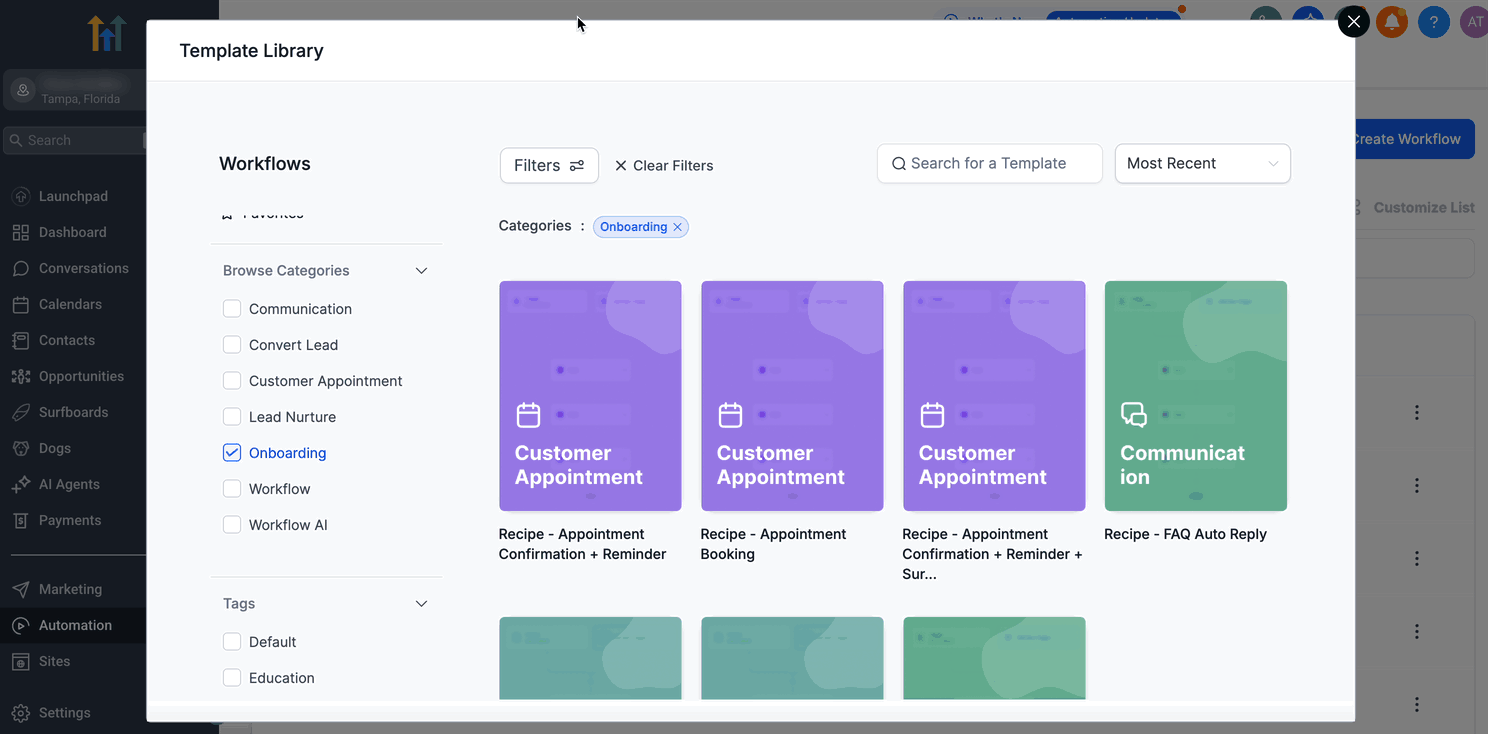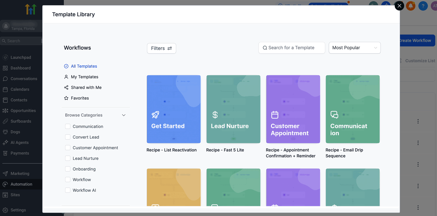Die Template-Bibliothek für Workflows ist eine neue HighLevel-Funktion, die es Benutzern ermöglicht, Automationen mit professionell gestalteten Workflow-Templates zu starten. Anstatt Workflows von Grund auf zu erstellen, kannst du ein Template auswählen, das deinen Anforderungen entspricht, seine Struktur überprüfen und bei Bedarf anpassen. Dies beschleunigt den Start und sorgt dafür, dass Workflows auf bewährten Vorlagen basieren.
