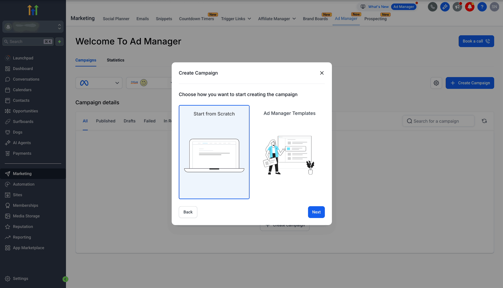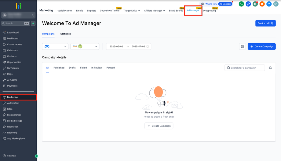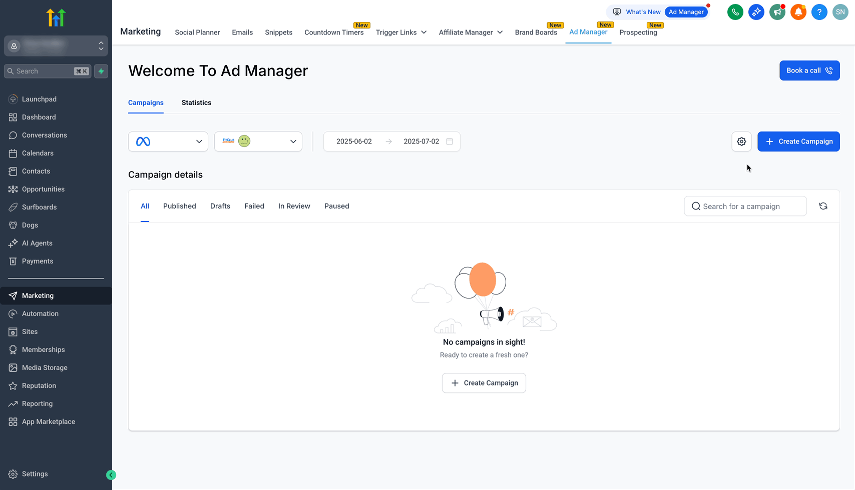 Klicken Sie auf die Schaltfläche + Create Campaign.