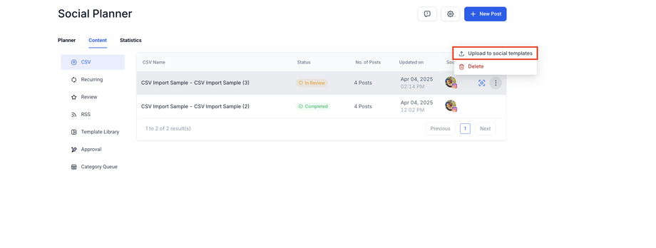 Wechseln Sie zum CSV-Tab oder Template Library-Tab unter Content.