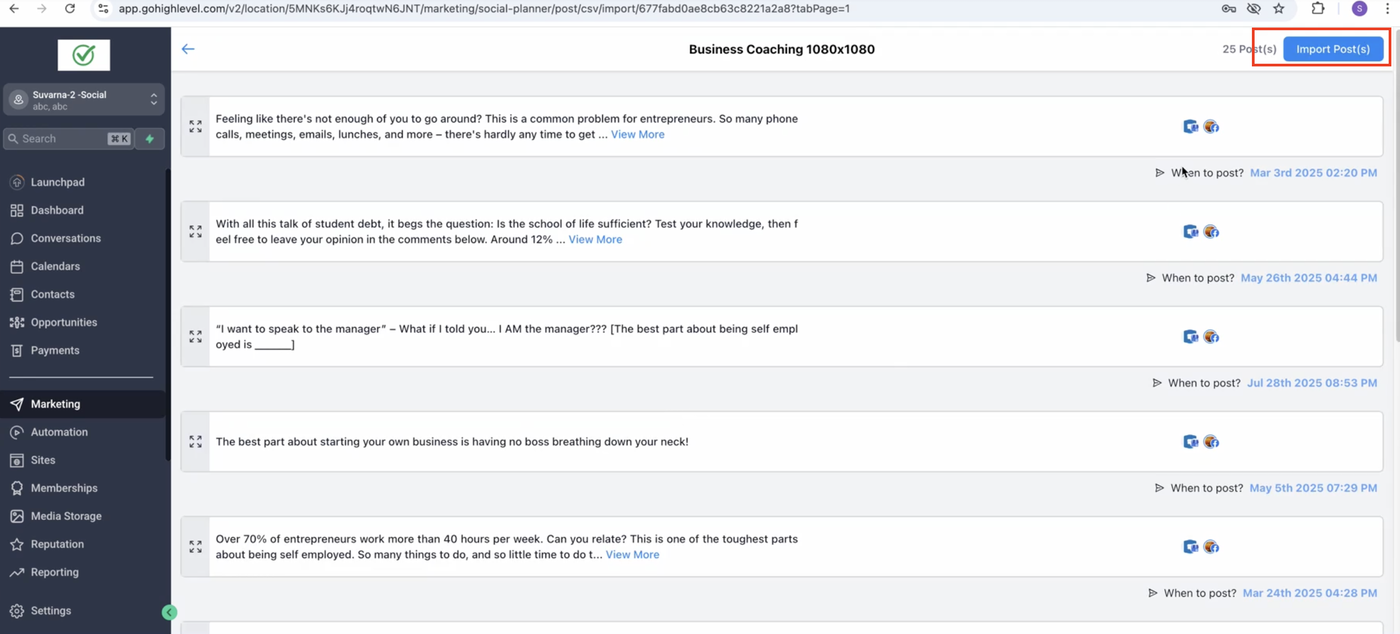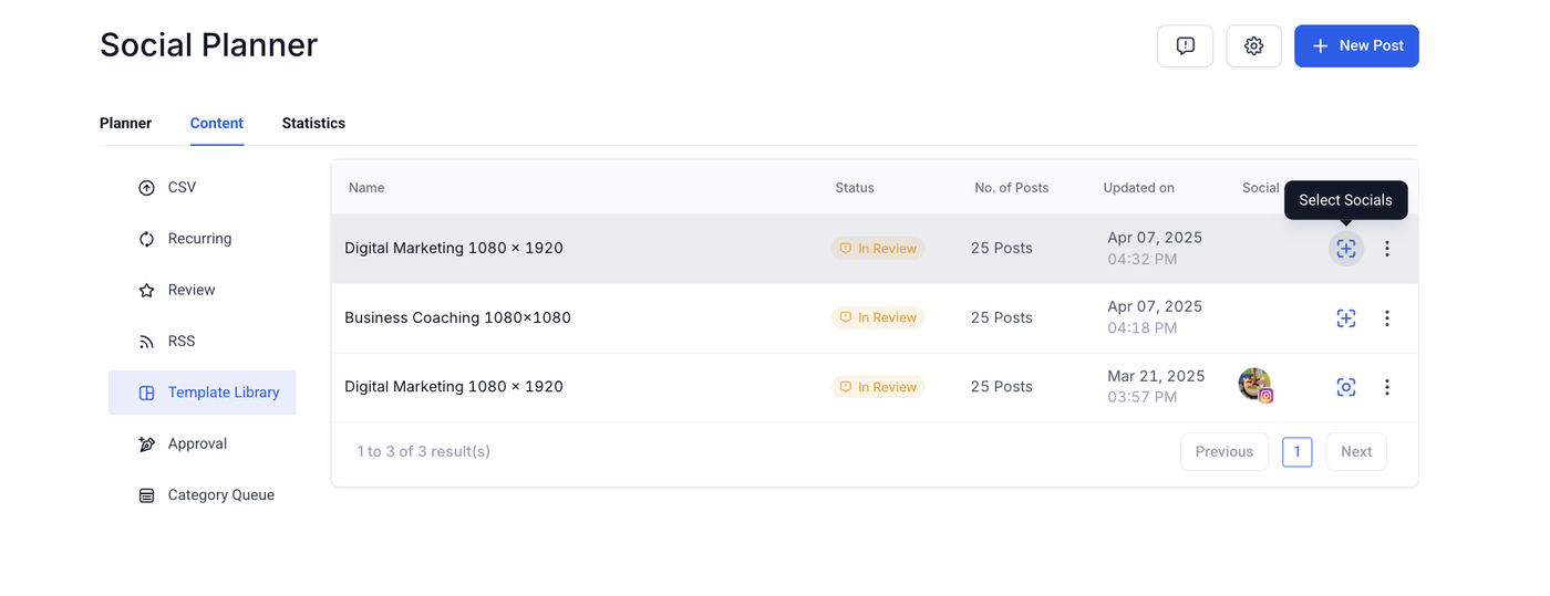 Klicken Sie auf die Schaltfläche „New Posts“, um einen neuen Social-Media-Beitrag zu erstellen.