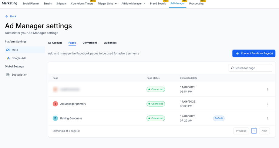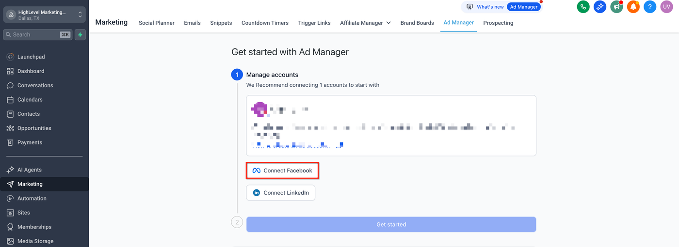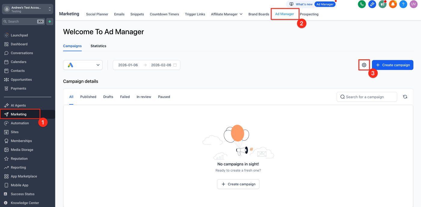 Die Ad-Manager-Einstellungen sind die zentrale Konfigurationsstelle für deine Werbeinfrastruktur in HighLevel. Hier werden deine Meta- und Google-Assets verbunden, festgelegt, wie Conversions erfasst und übermittelt werden, Zielgruppen für Kampagnen verwaltet und der Abonnement-Zugriff gesteuert. So wird sichergestellt, dass Anzeigen korrekt reporten und zuverlässig über mehrere Accounts hinweg skalieren.