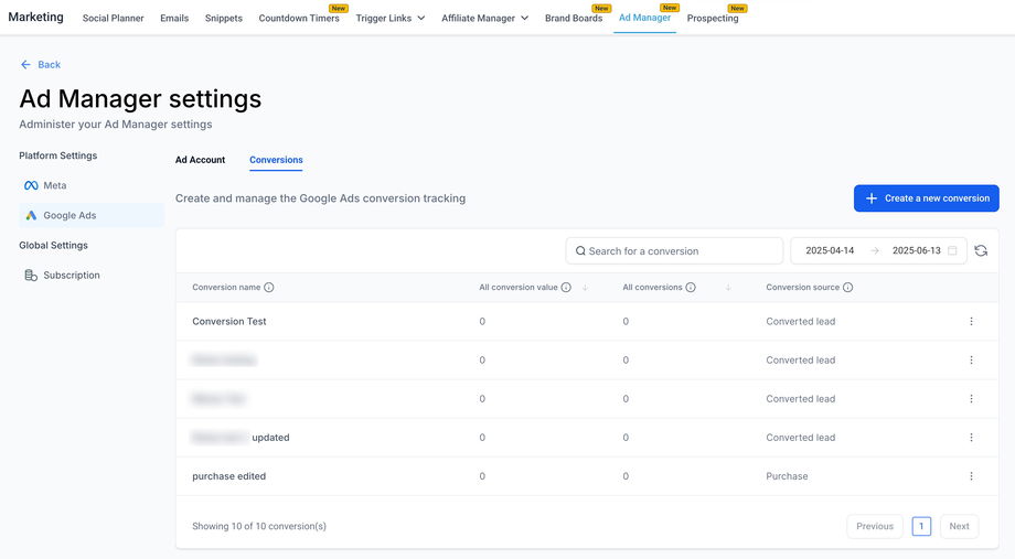 Erstellen/Bearbeiten/Löschen von Google-Conversion-Aktionen direkt in diesem Tab.