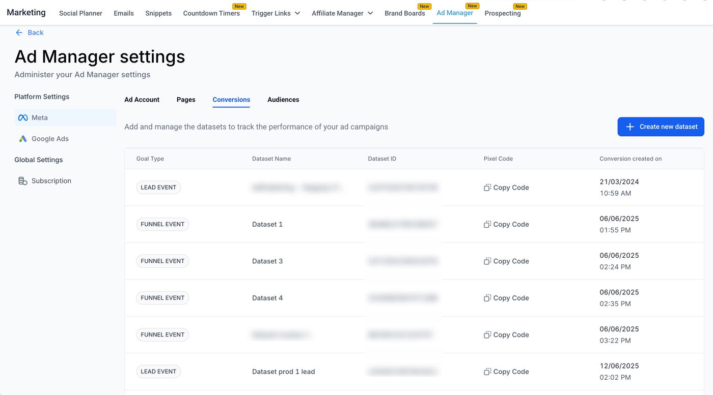 Datensatz & Pixel: Der Ad Manager stellt einen Pixel-Code bereit, der auf Funnels/Websites eingebunden wird.