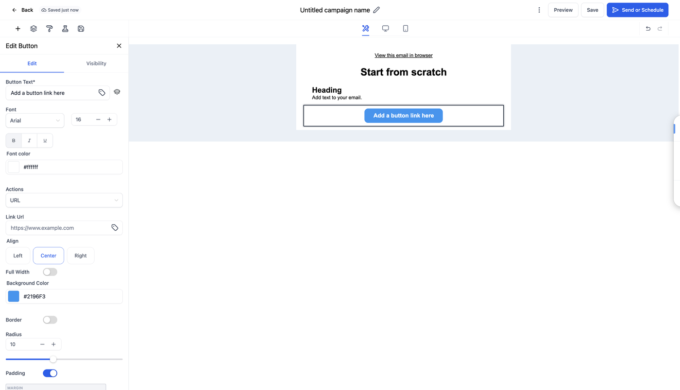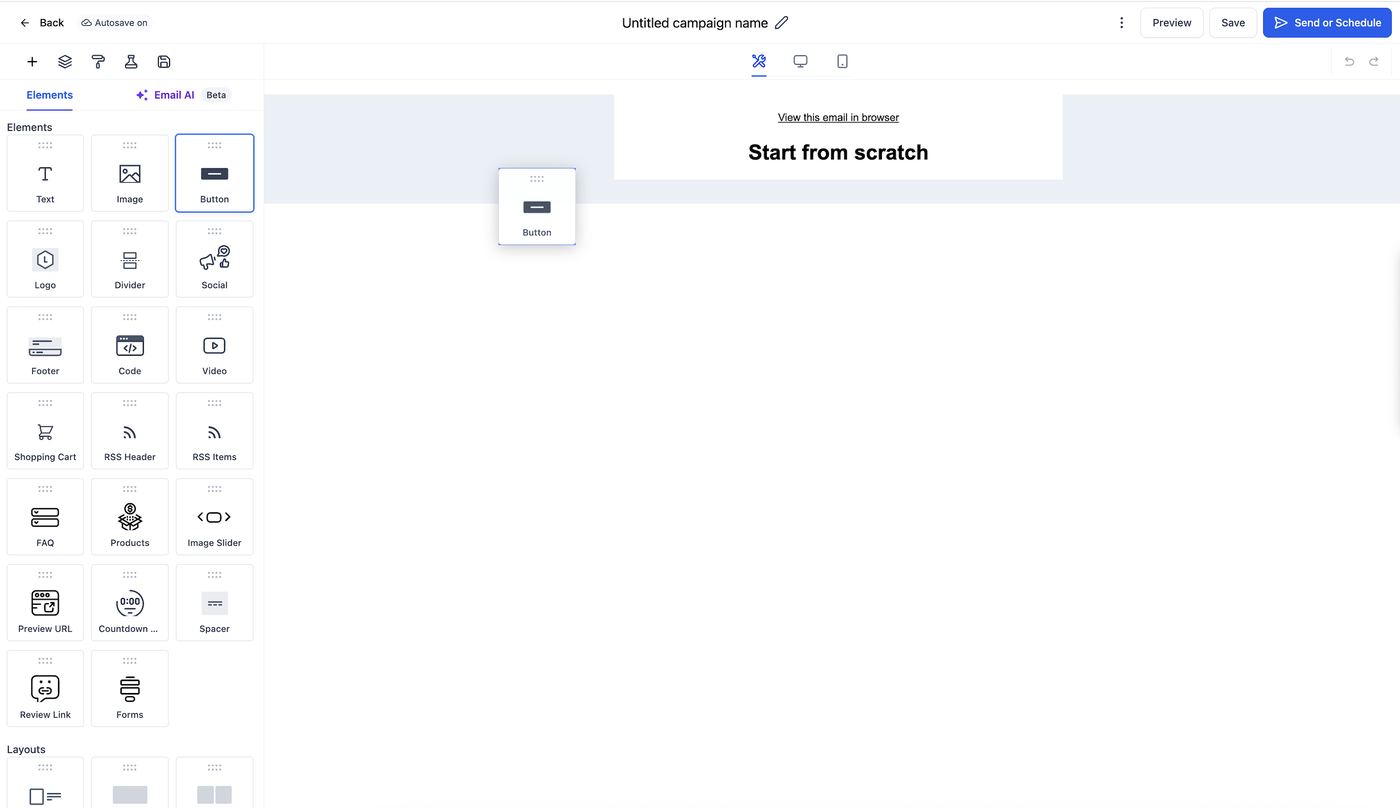 Gewinnen Sie die vollständige Kontrolle darüber, wie Sie E-Mails gestalten und anpassen, mit Drag-and-Drop-Elementen im E-Mail-Builder. Von Text und Buttons bis hin zu Bildern, Videos und Countdown-Timern – Elemente ermöglichen es Ihnen, visuell ansprechende und funktionale E-Mails zu erstellen, ohne zu programmieren.