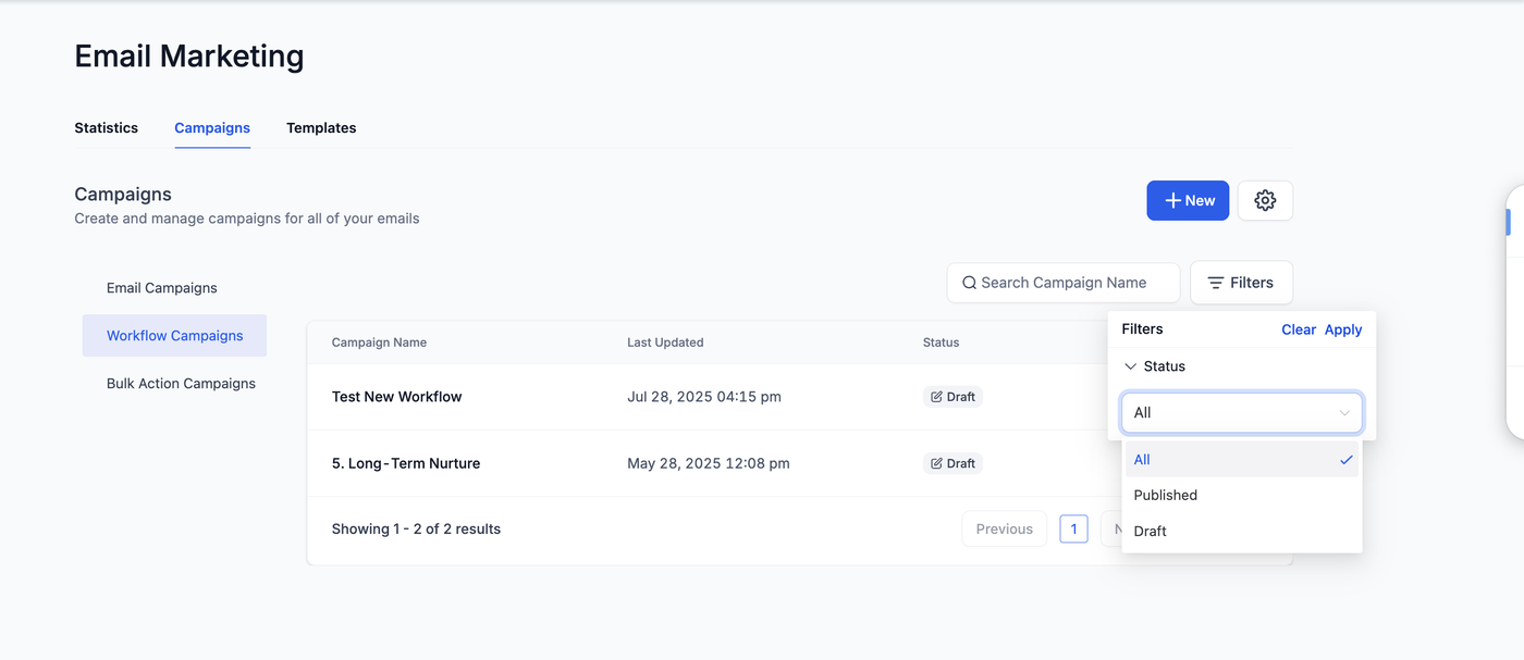 Zeigt alle Workflow-Kampagnen an, sowohl Entwürfe als auch veröffentlichte Kampagnen.