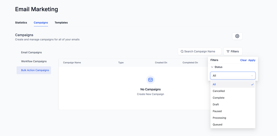 Zeigt alle Bulk-Action-Kampagnen an, unabhängig vom Status.