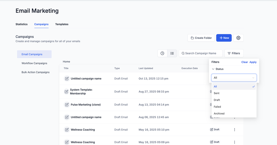 Jeder Kampagnentyp – E-Mail-Kampagnen, Workflow-Kampagnen und Bulk-Action-Kampagnen – verfügt über spezifische Statusanzeigen, mit denen Sie schnell erkennen können, ob sich eine Kampagne im Entwurf befindet, aktiv ist, gesendet wurde oder abgeschlossen ist.