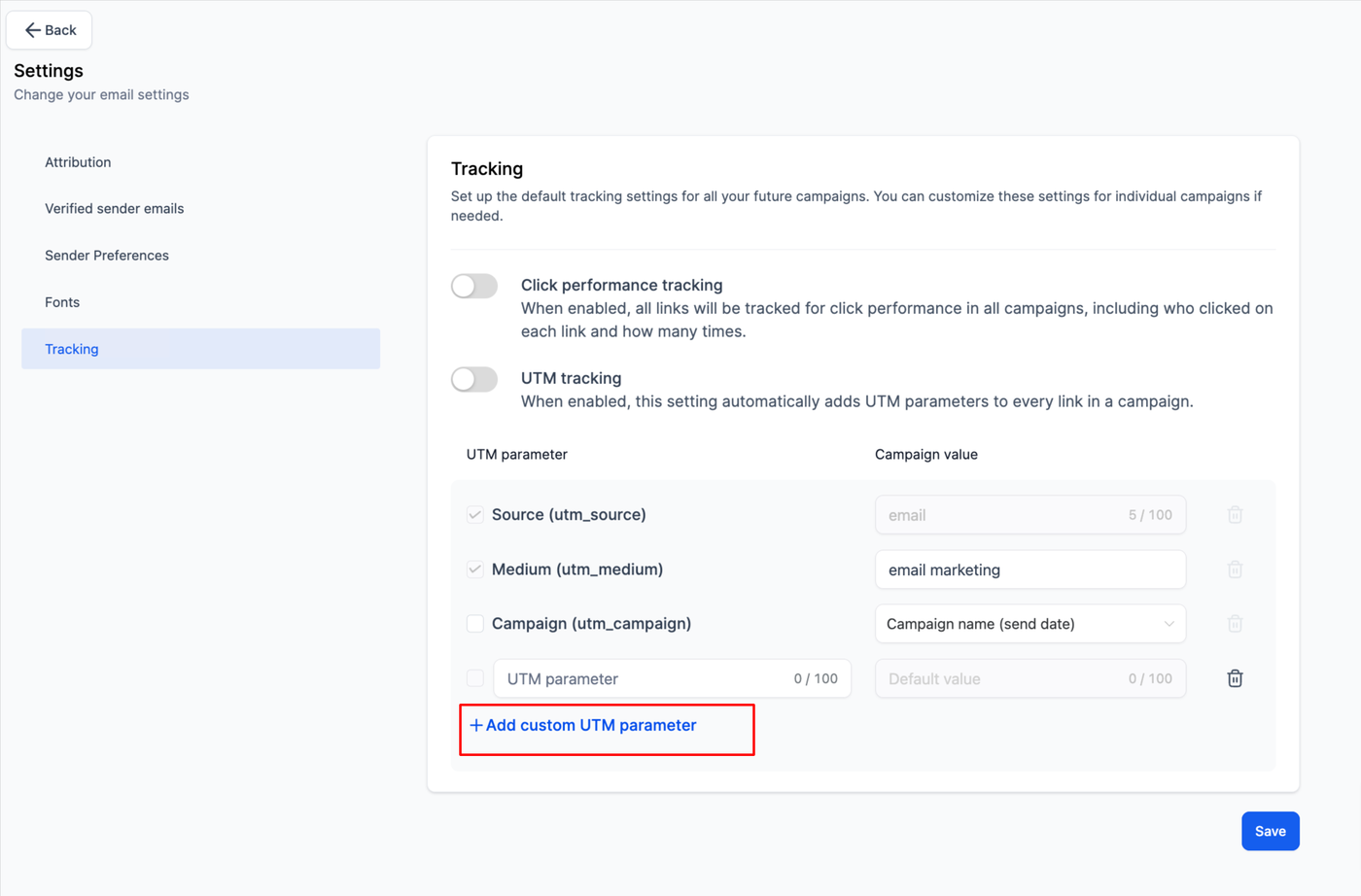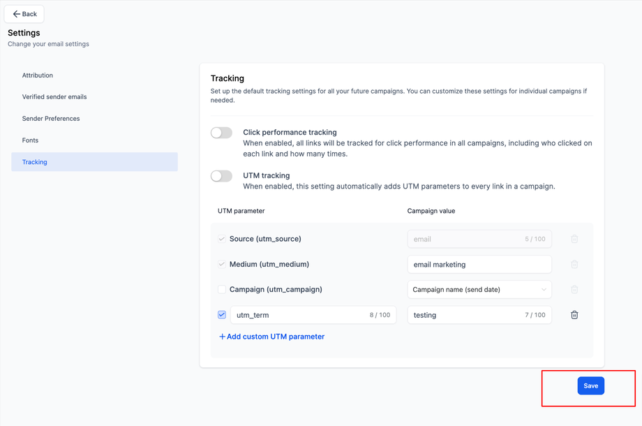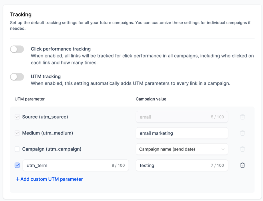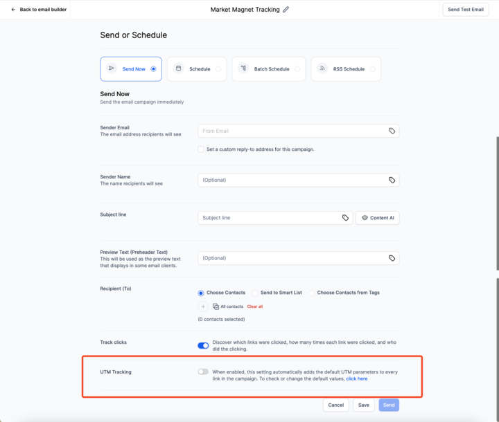 Für einzelne Kampagnen deaktivieren: Um UTM-Parameter für eine bestimmte Kampagne zu deaktivieren, schalten Sie die Tracking-Option auf der Seite Send or Schedule aus.