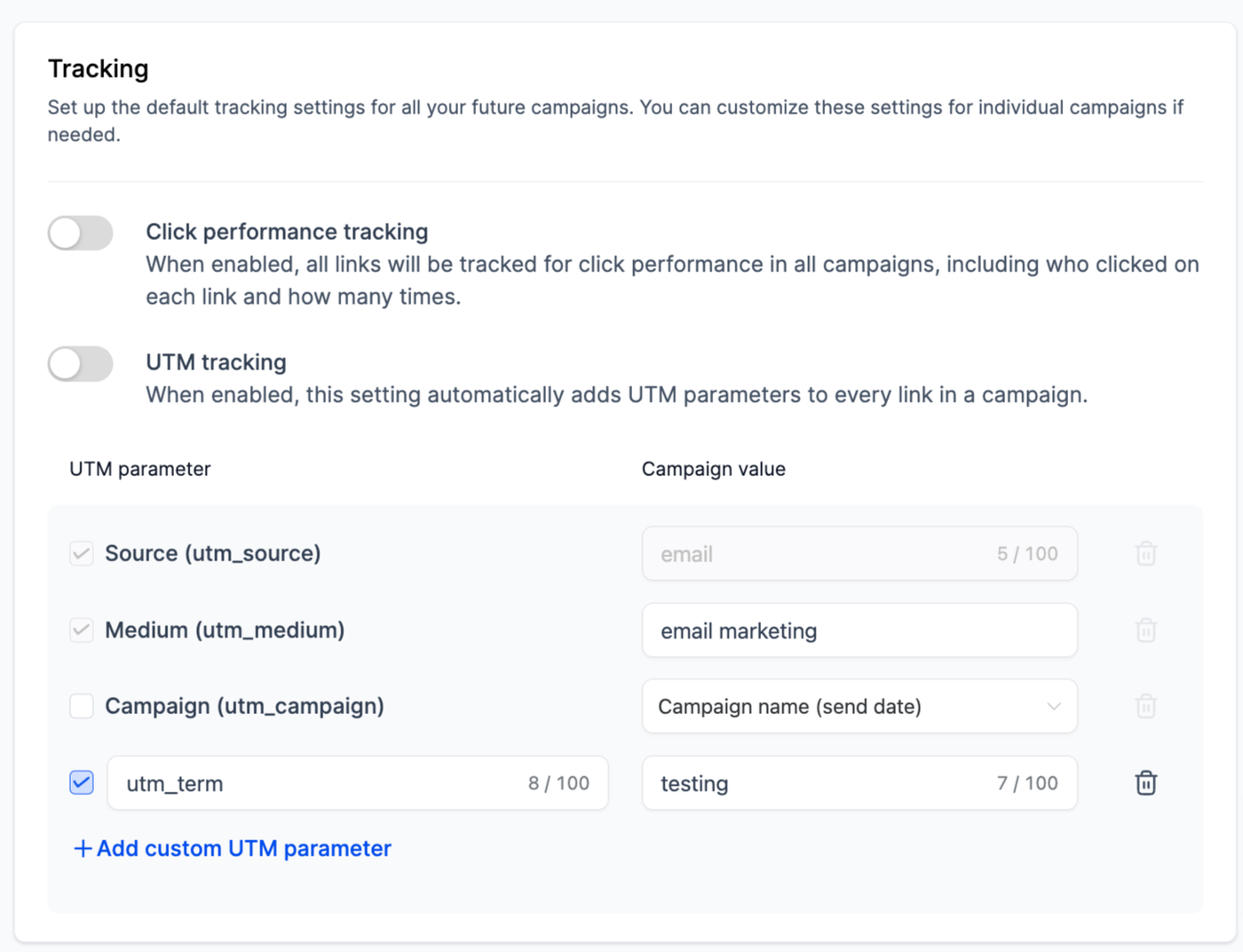 Standard-UTM-Parameter aktivieren: Um UTM-Parameter standardmäßig auf alle Kampagnen anzuwenden, aktivieren Sie den entsprechenden Schalter.