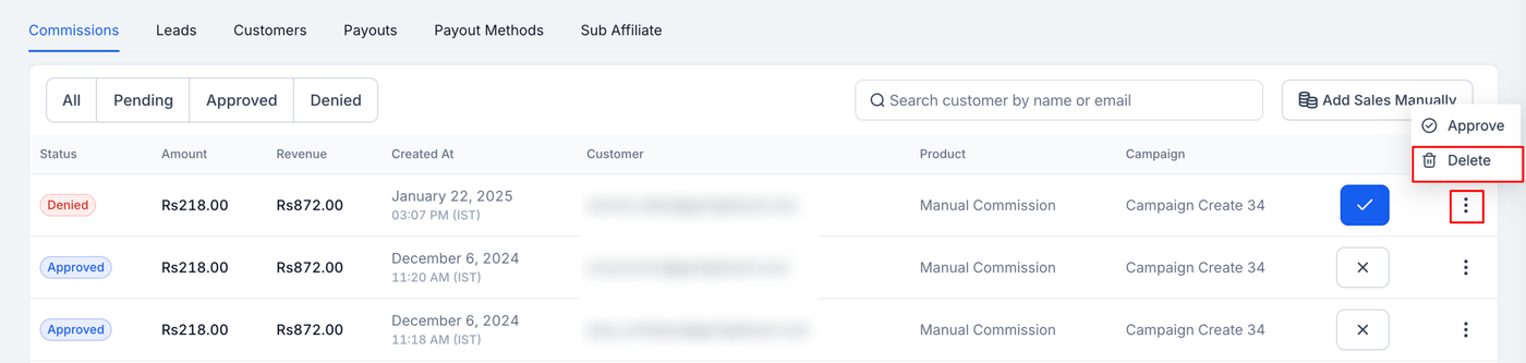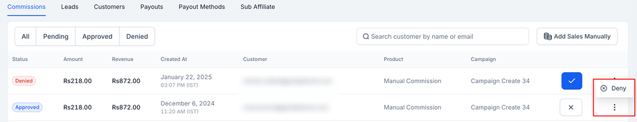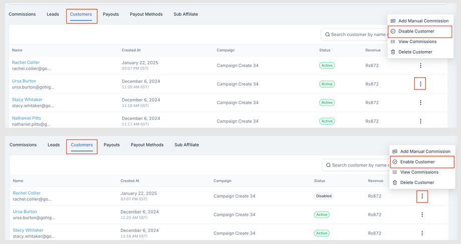 Wenn ein Kunde als „Deaktiviert“ markiert wird, werden keine weiteren Verkäufe verfolgt und keine Provisionen mehr generiert.