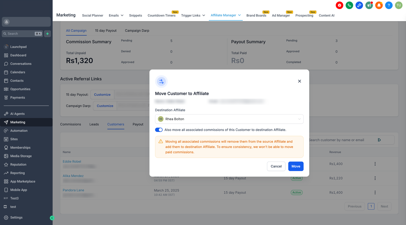 „Auch alle zugehörigen Provisionen dieses Kunden zum Ziel-Affiliate verschieben“, wenn nicht ausgezahlte Provisionen übertragen werden sollen.Klicken Sie auf Verschieben, um den Vorgang abzuschließen.