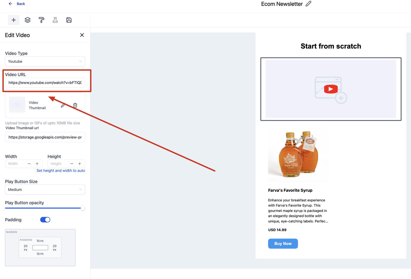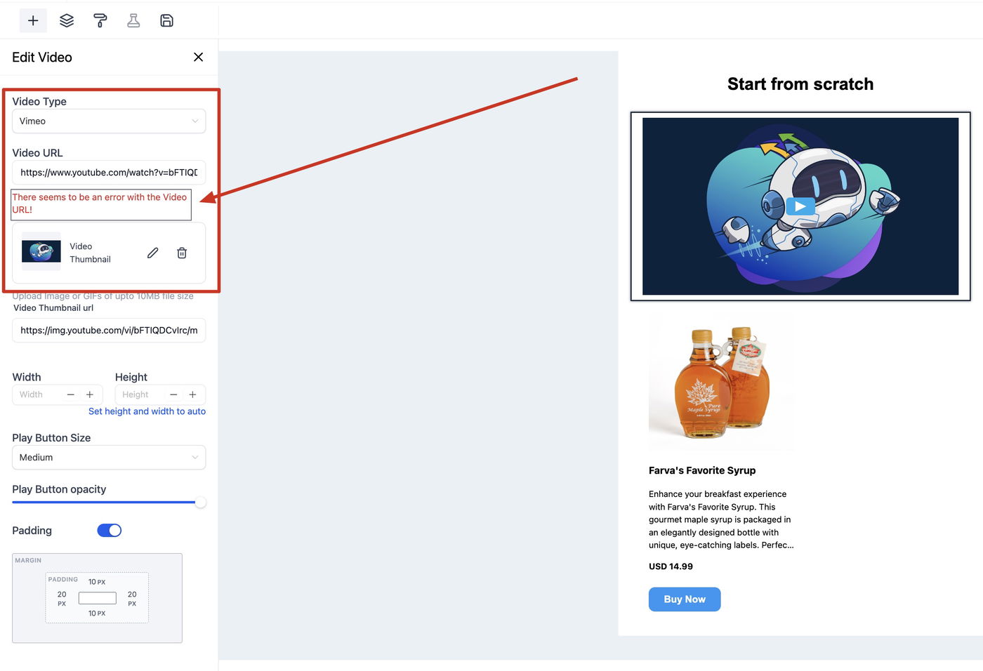 Der Editor versucht automatisch, ein Thumbnail basierend auf dem Video-URL zu generieren.