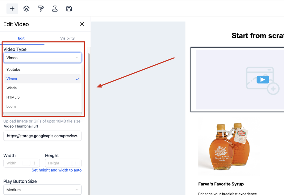Wählen Sie aus: YouTube, Vimeo, Wistia, HTML5.