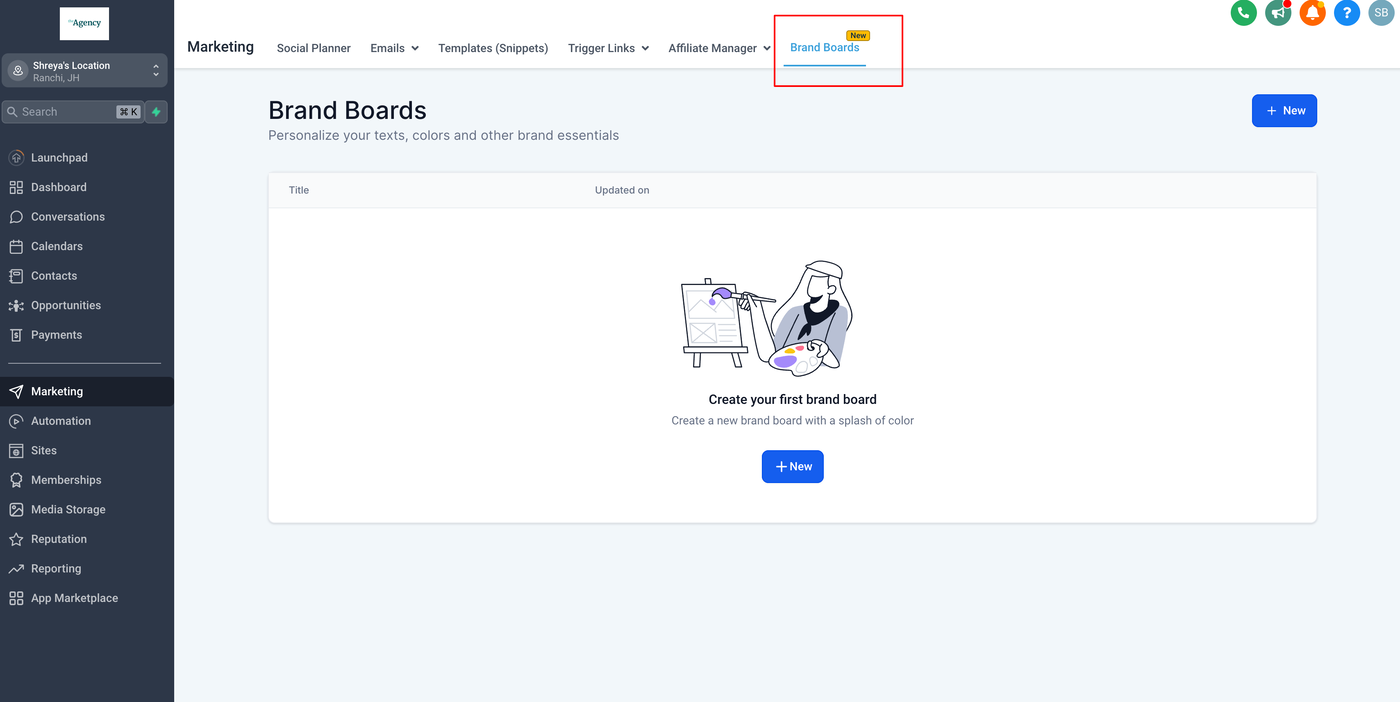 Ein Brand Board speichert deine zentrale visuelle Markenidentität (Farben, Schriftarten und Logos), damit du ein konsistentes Design in HighLevel verwenden kannst.
