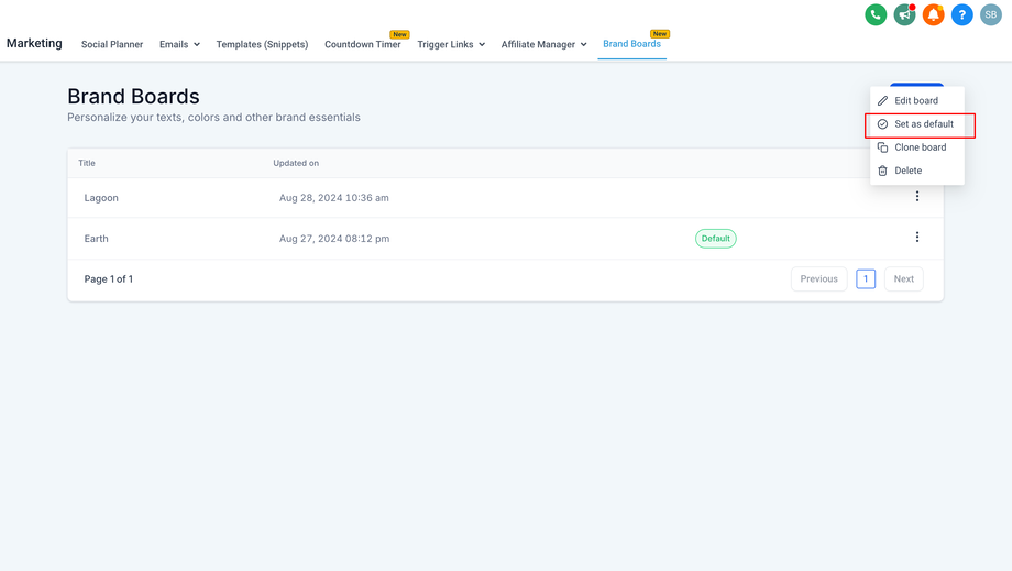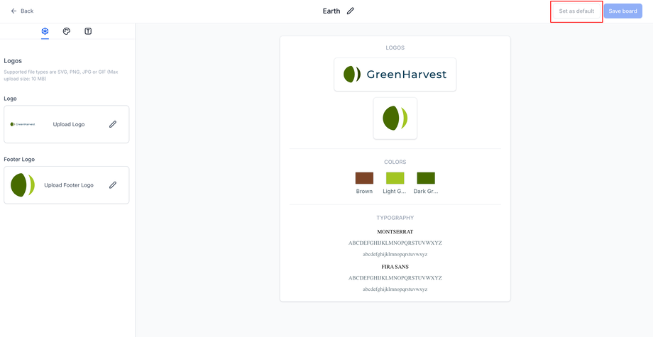 Standardmäßig wird das erste erstellte Brand Board automatisch als Standard festgelegt.