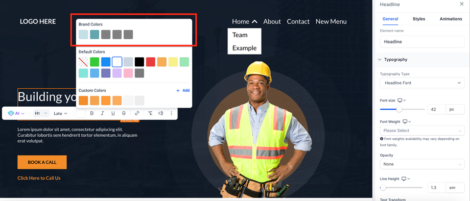 Beispielsweise werden im Site-Editor die Farben des Standard-Brand Boards angezeigt, sodass du dein Design einfach an deinen Markenrichtlinien ausrichten kannst.