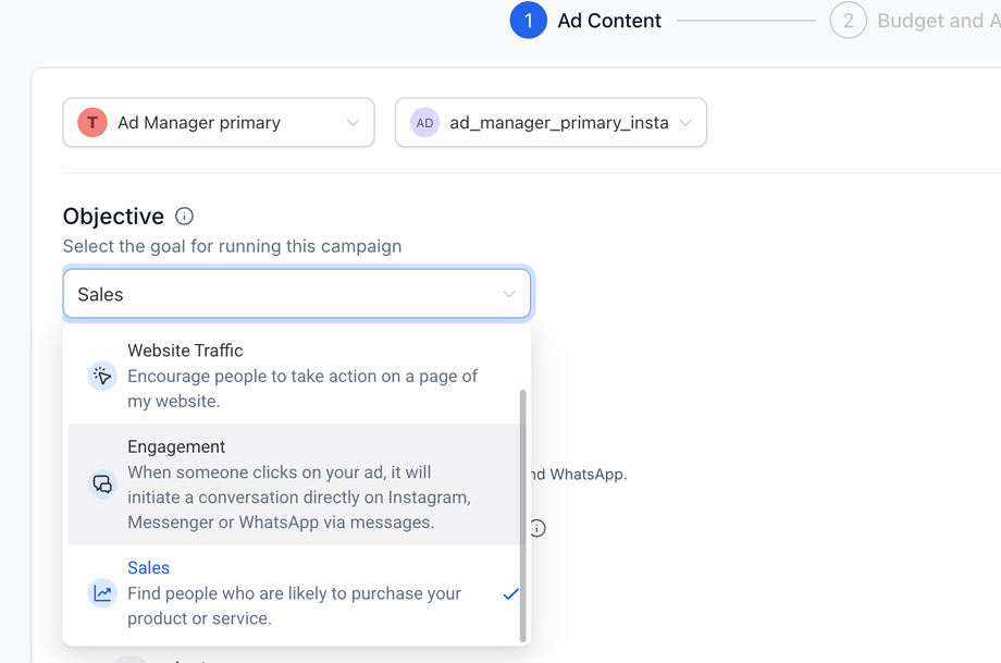 Das Sales-Ziel hilft dabei, Conversions mit Fokus auf direkte Verkäufe zu erzielen – entweder über Website-Traffic oder Messaging-Apps.