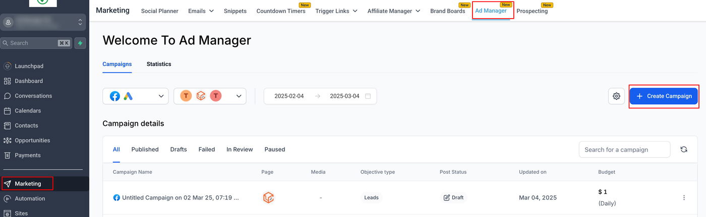 Gehen Sie zu Sub-Account > Marketing > Ad Manager, sofern Ihr Onboarding abgeschlossen ist.