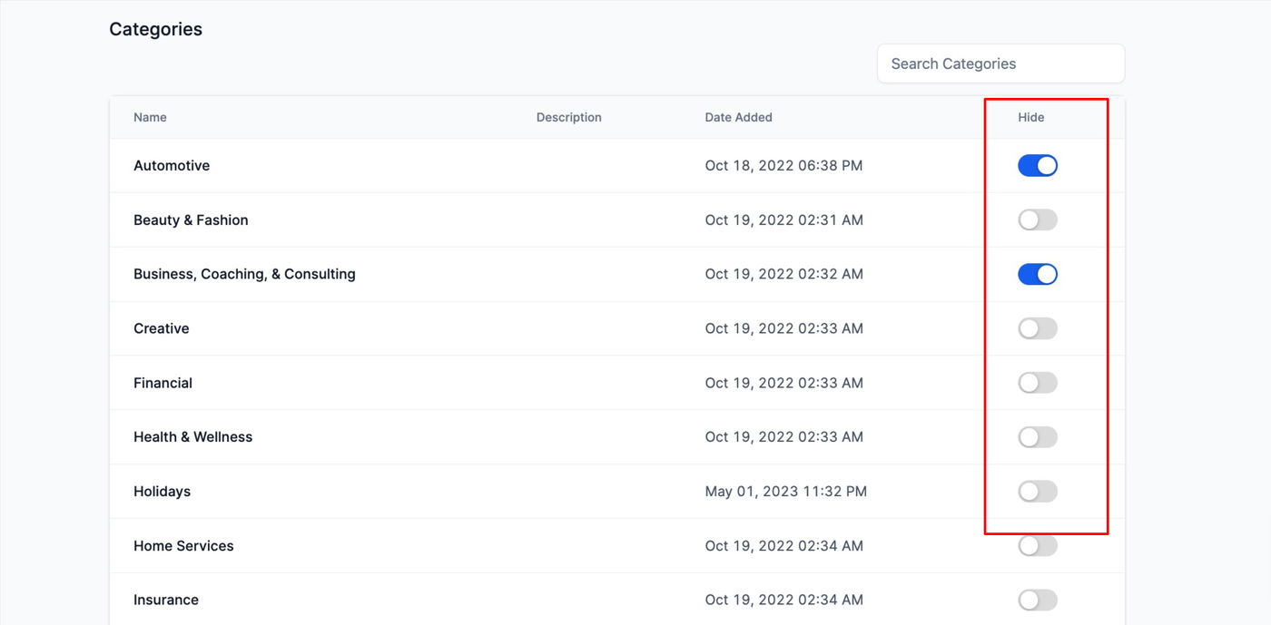 Wählen Sie die Kategorie aus, die Sie ausblenden möchten, und aktivieren Sie den Toggle, um sie zu verbergen.