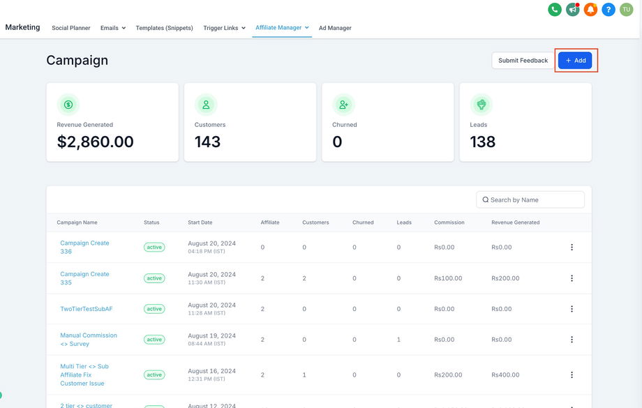 Klicken Sie auf die Kampagnen-Seite und dann auf die Schaltfläche + Hinzufügen, um eine neue Kampagne zu erstellen.