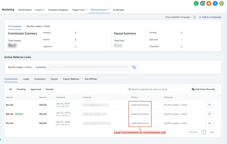 Leads überwachen: Sobald die Kampagne live ist, können Sie Leads und die dazugehörigen Provisionen direkt auf der Profilseite des jeweiligen Affiliates verfolgen.