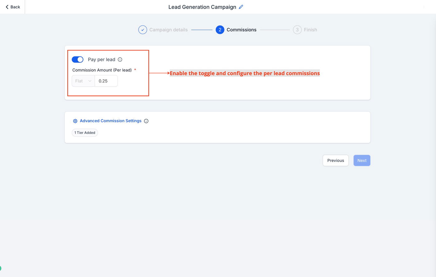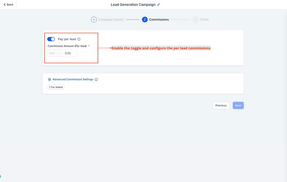 Gehen Sie zum Tab Provisionen und aktivieren Sie die Option Pay-per-Lead, um diese Provisionsstruktur zu aktivieren.