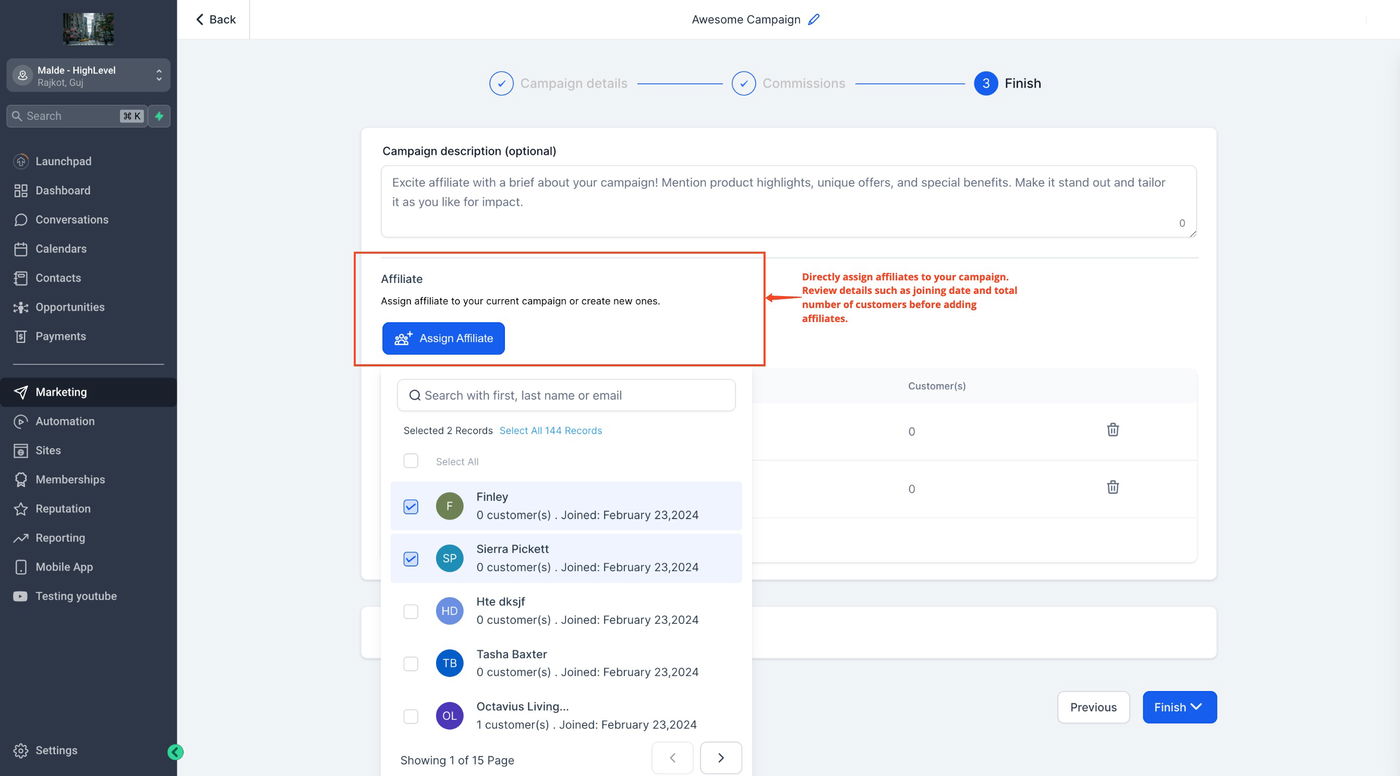 Überprüfen Sie die Details der Affiliates, z. B. Beitrittsdatum und Gesamtzahl der Affiliates, bevor Sie diese direkt Ihrer Kampagne zuweisen.