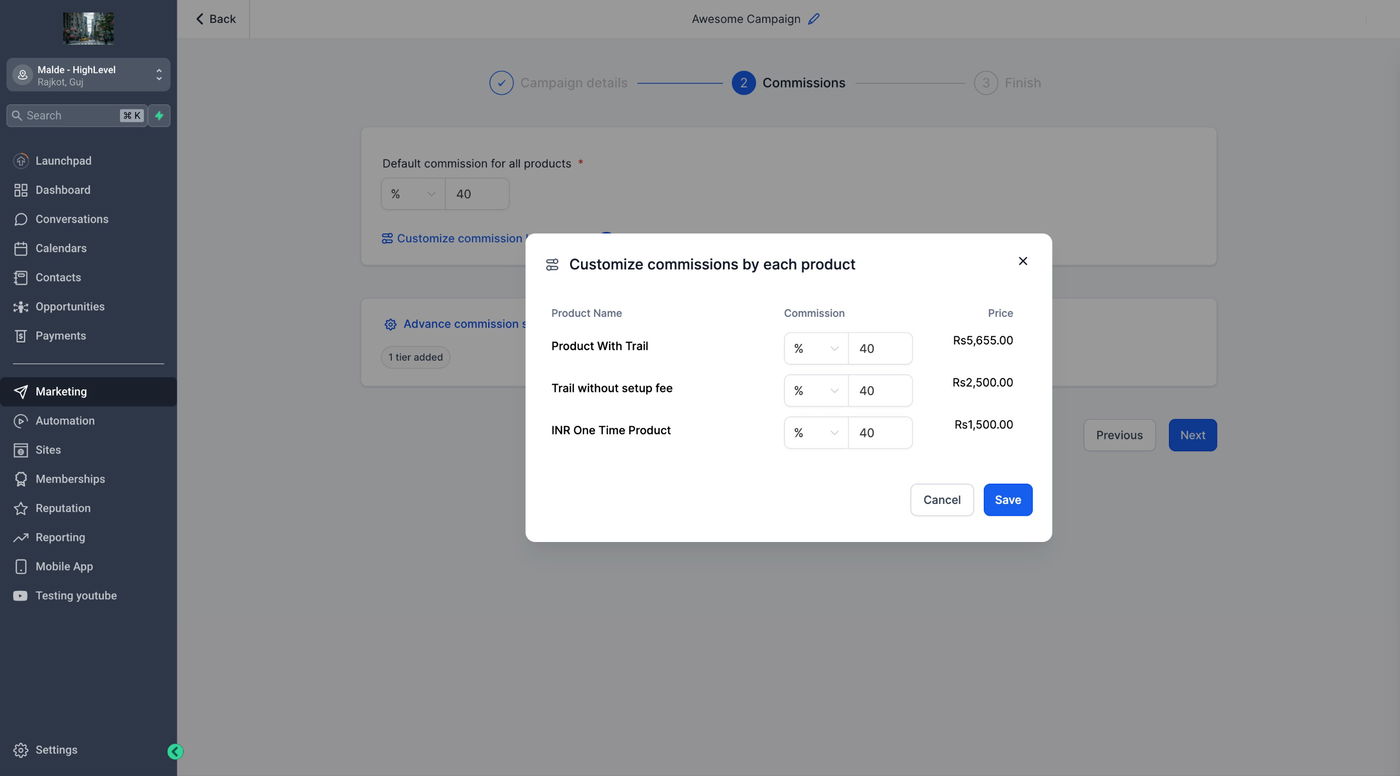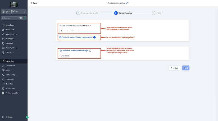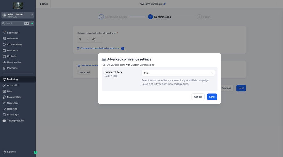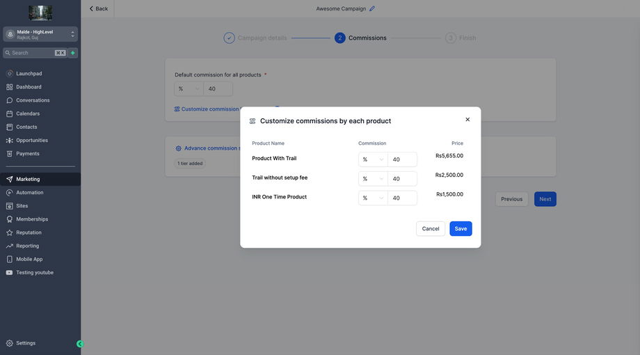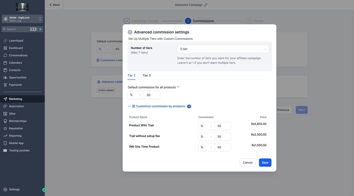 Weisen Sie jeder Stufe Provisionen zu, entweder durch Anwendung des Standardsatzes oder durch individuelle Anpassung für jede Ebene basierend auf Leistung.