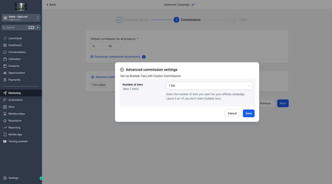 Gehen Sie zu den erweiterten Provisions-Einstellungen, um Multi-Tier-Provisionen zu aktivieren. Sie können bis zu 7 Stufen für komplexere Provisionsstrukturen nutzen.
