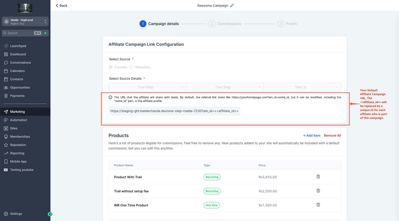 Sie können auch die Landingpage auswählen, auf der potenzielle Kunden landen. Nach der Auswahl generiert das System eine Standard-URL für die Kampagne. Diese URL enthält einen einzigartigen Affiliate-Link, wobei der Platzhalter <<affiliate_id>> automatisch durch die eindeutige ID jedes Affiliates ersetzt wird.