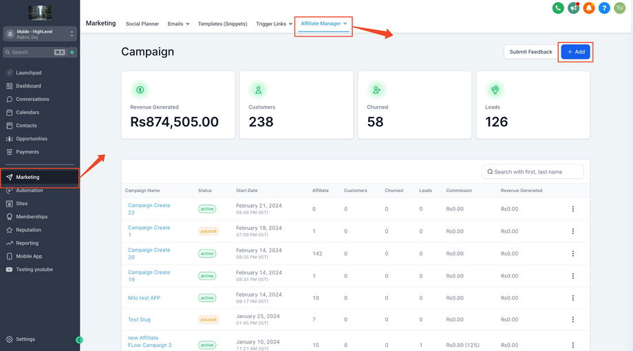 Navigieren Sie zur Kampagnen-Seite und klicken Sie auf die Schaltfläche „+ Hinzufügen“, um die Erstellung Ihrer Kampagne zu starten.