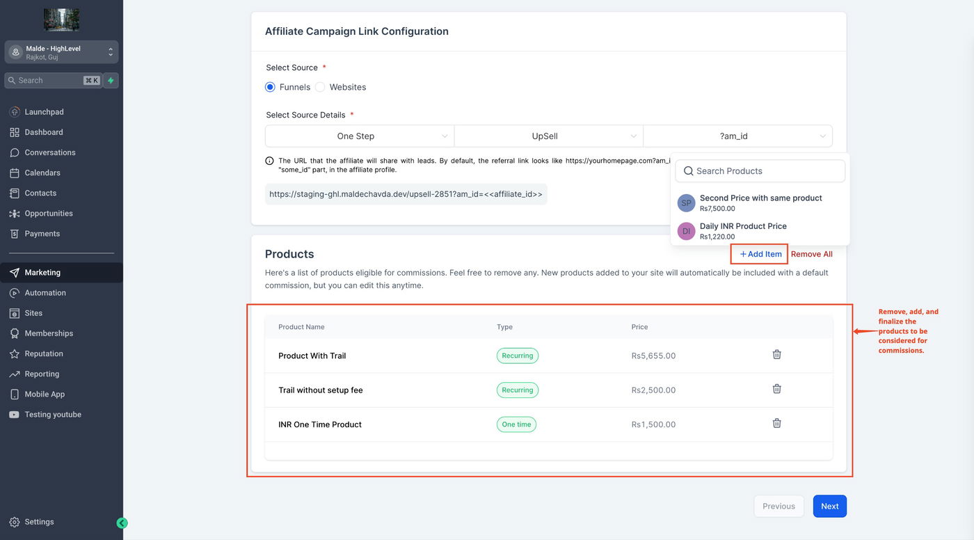 Überprüfen Sie die Produkte, die mit Ihrer ausgewählten Quelle verknüpft sind. Fügen Sie Produkte hinzu oder entfernen Sie sie, um sicherzustellen, dass nur provisionsberechtigte Produkte gelistet sind.