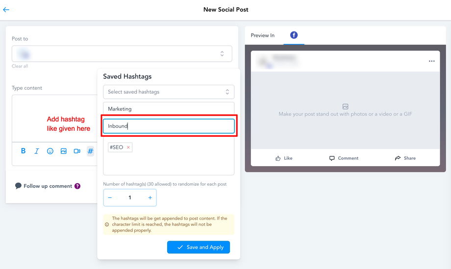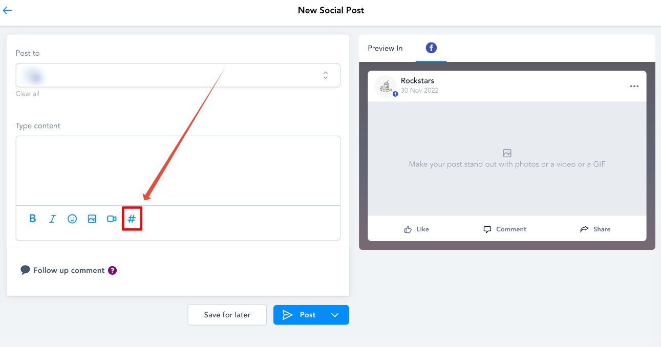 Im Fenster Create Post gibt es die Option, Hashtags mit # hinzuzufügen