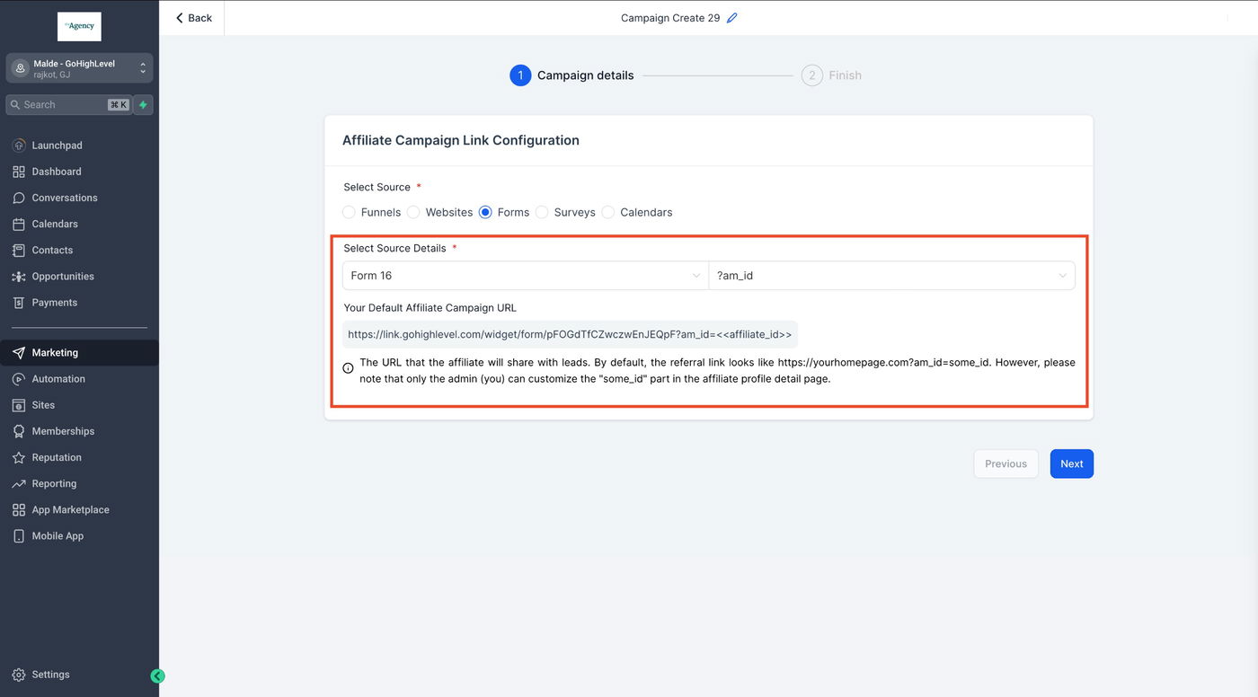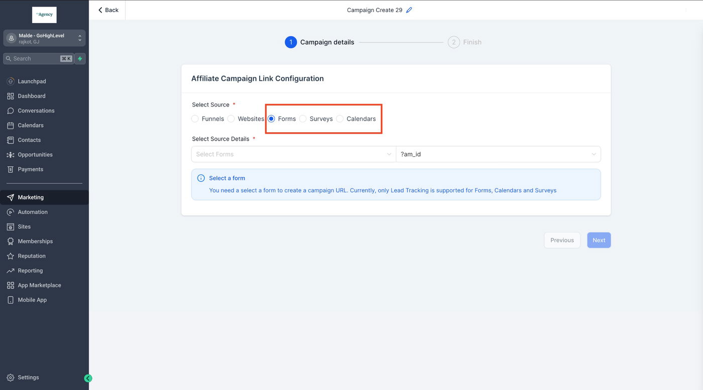 Wählen Sie Formulare, Umfragen oder Kalender als Quelle für Ihre Kampagne aus. Diese Quellen ermöglichen es, Leads, die durch die Arbeit Ihrer Affiliates generiert werden, nahtlos zu verfolgen.