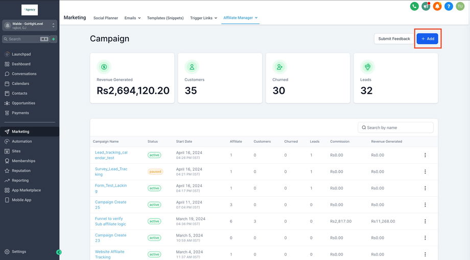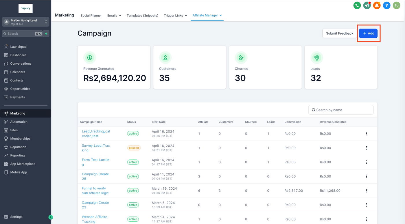 Sobald Sie sich auf der Kampagnen-Seite befinden, klicken Sie auf die Schaltfläche „Hinzufügen“, um eine neue Kampagne für das Lead-Tracking zu erstellen.