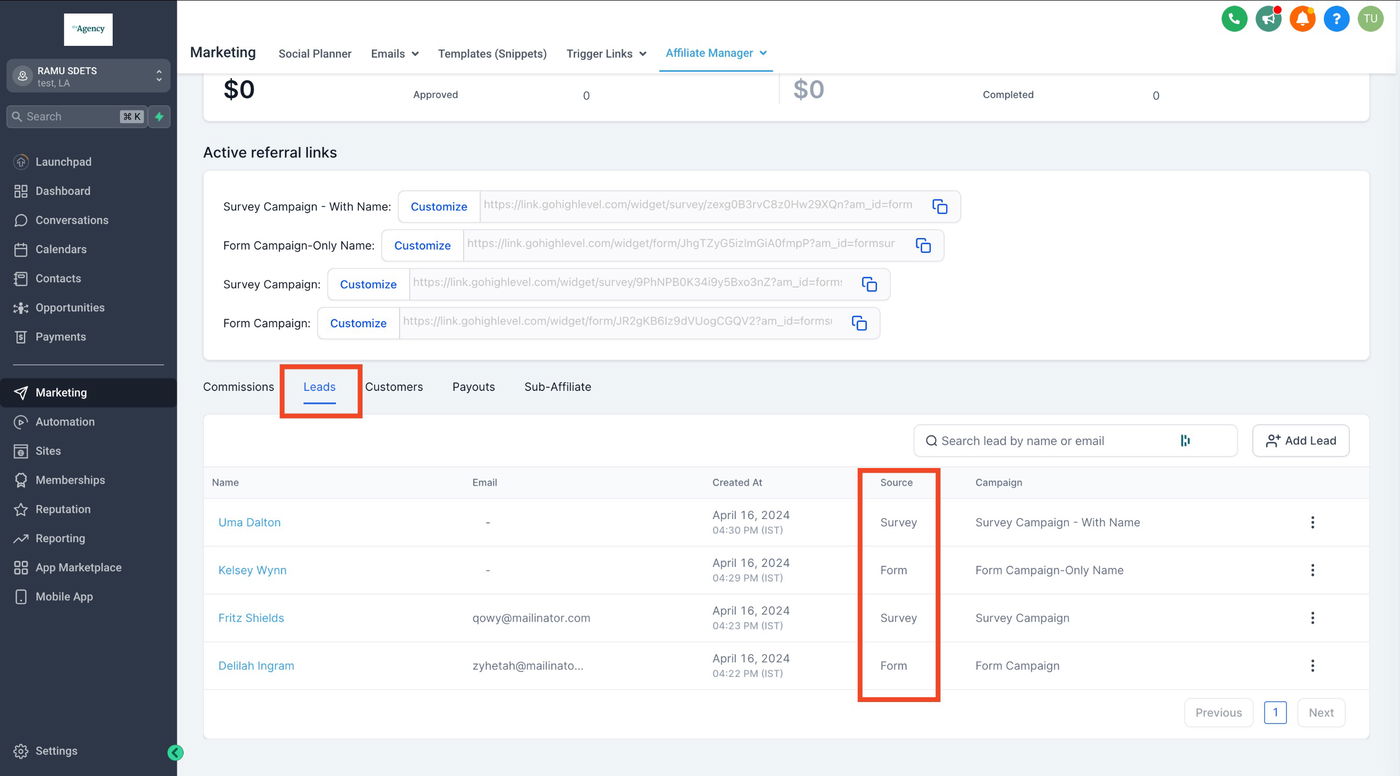 Nach der Veröffentlichung werden die Leads automatisch im Profil jedes Affiliates erfasst. Navigieren Sie zum Tab Leads, um die über Formulare, Umfragen oder Kalender generierten Leads einzusehen. Sie können das Feld Quelle verwenden, um den Ursprung jedes Leads zu identifizieren.