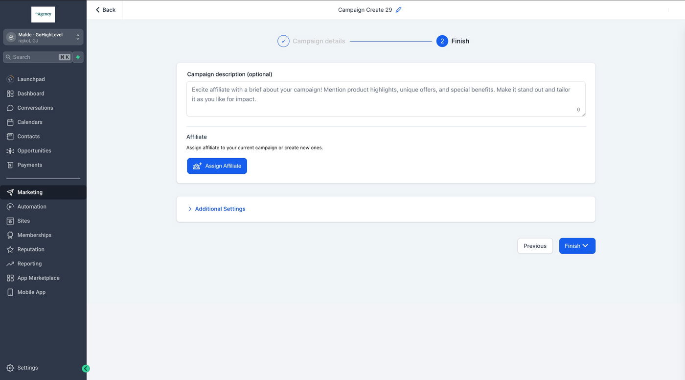 Sie können die Kampagne weiter anpassen, indem Sie Kampagnenbeschreibungen hinzufügen, Affiliates zuweisen und weitere Einstellungen nach Bedarf anpassen.