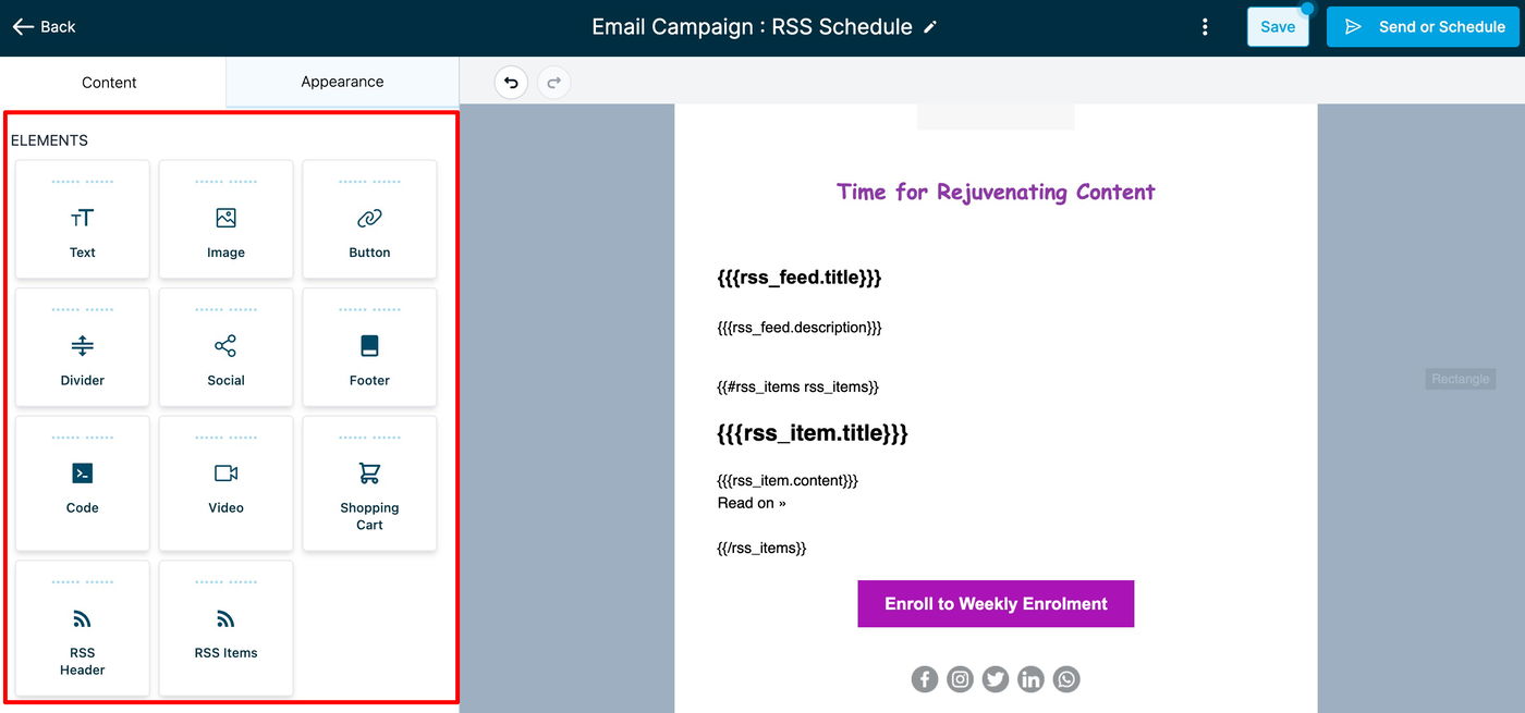 Der Email Builder bietet Tools, um Ihre Kampagne zu gestalten. Platzieren Sie alle notwendigen Elemente. Danach klicken Sie auf „Send or Schedule“.
