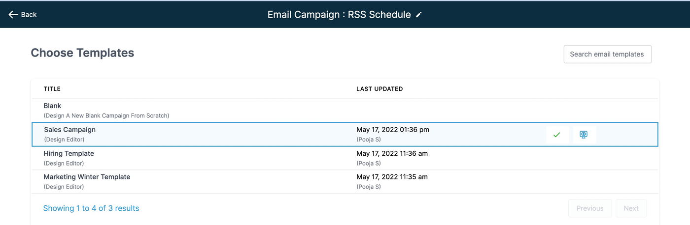 Wählen Sie die Vorlage aus, die Sie für Ihre Marketing-E-Mail-Kampagne nutzen möchten. Vorschau ist verfügbar, um die Vorlage zu prüfen.