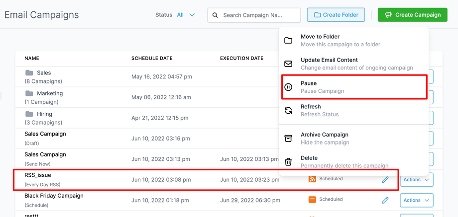 Pausenoption für RSS-E-Mail-Kampagnen ist verfügbar.