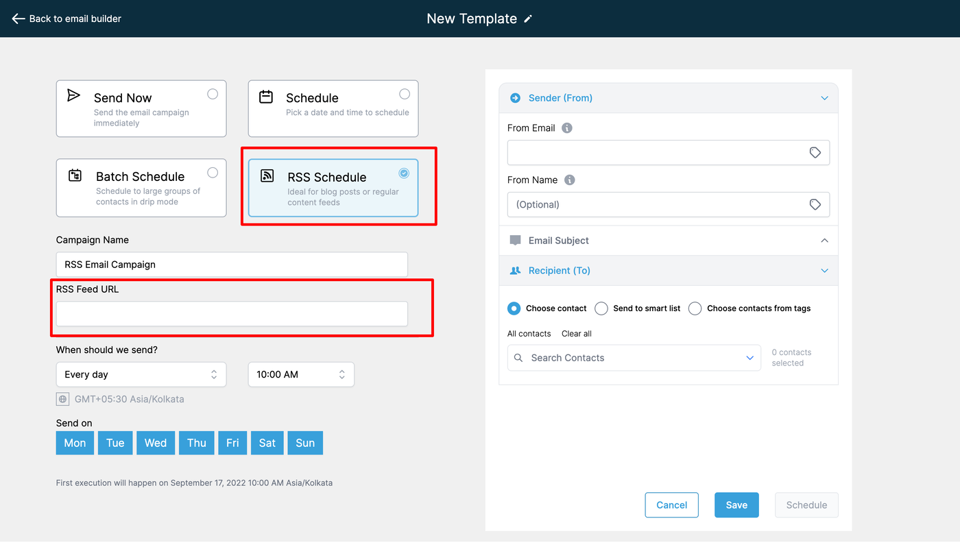 Eine RSS-E-Mail in HighLevel ermöglicht es Ihnen, eine Vorlage auszuwählen, Inhalte zu gestalten und die Einstellungen für Empfänger und Versandmethode als RSS-Planung für täglich, wöchentlich oder monatlich festzulegen.