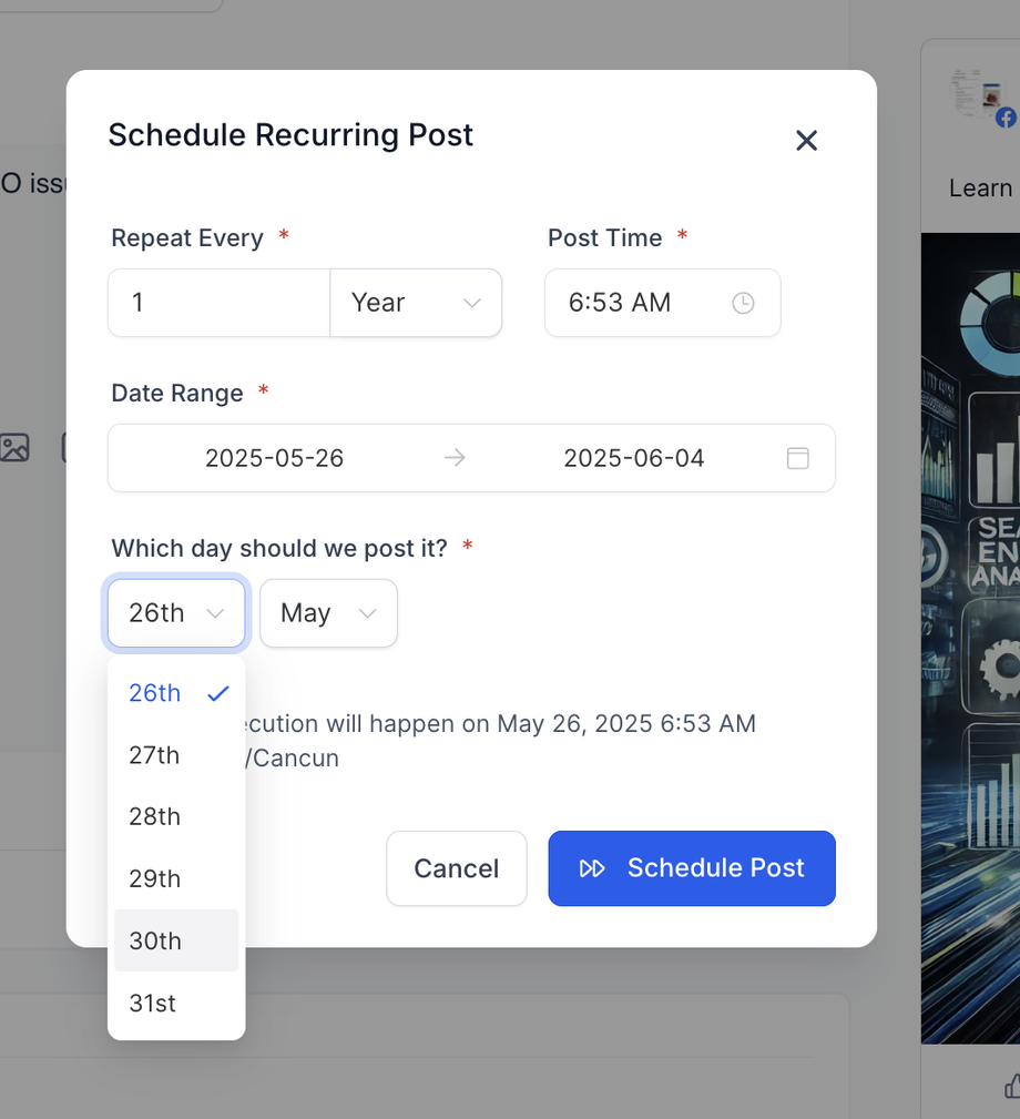 Jahr – Der Nutzer muss Datum und Uhrzeit auswählen, um den Post einmal im Jahr zu wiederholen.