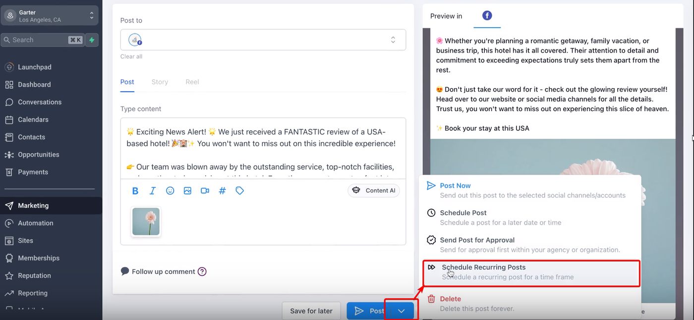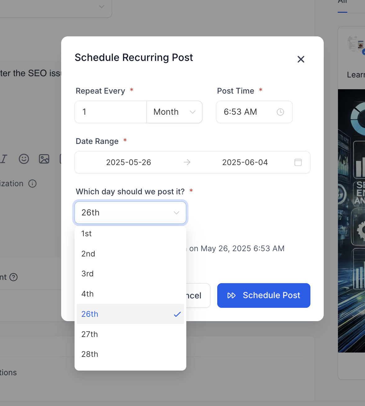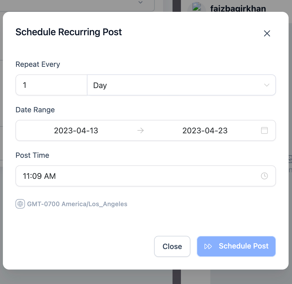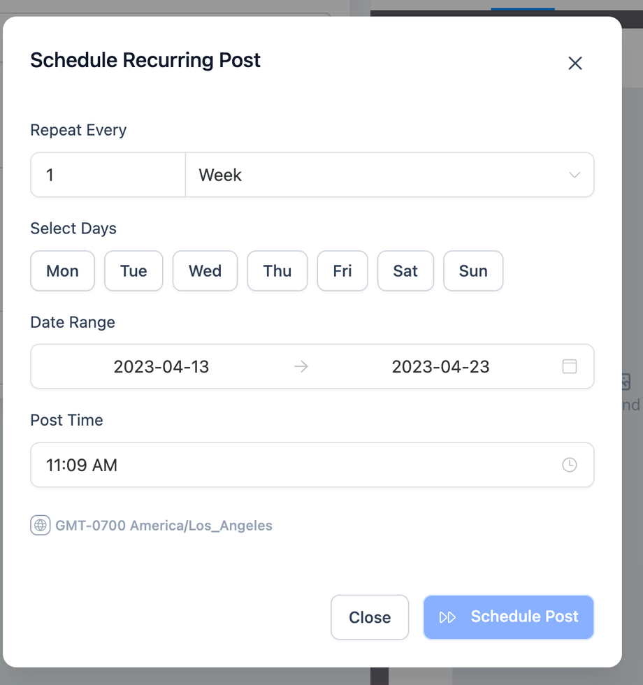 Flexible Planung: Nutzer können Posts täglich, wöchentlich, monatlich oder jährlich wiederholen lassen. Sie können bestimmte Wochentage, Datumsbereiche und Uhrzeiten nach ihren Vorlieben auswählen.