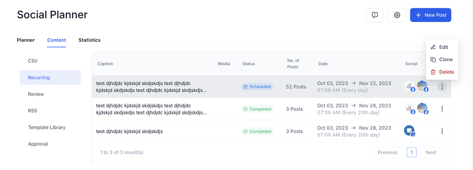 Überwachung und Verwaltung: Nutzer können alle wiederkehrenden Posts über eine einfache Oberfläche verfolgen und verwalten und behalten so die Kontrolle über ihren Social-Media-Content.