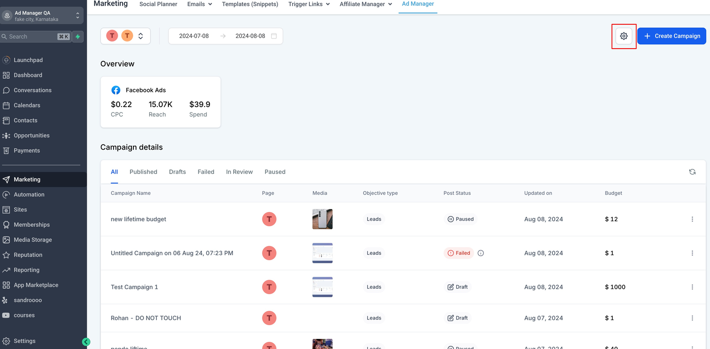 Auf der Ad Manager-Startseite können Sie zu den Ad Manager-Einstellungen navigieren, indem Sie auf das Einstellungen-Symbol klicken (im Screenshot unten hervorgehoben), das durch ein Zahnrad dargestellt wird.