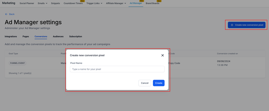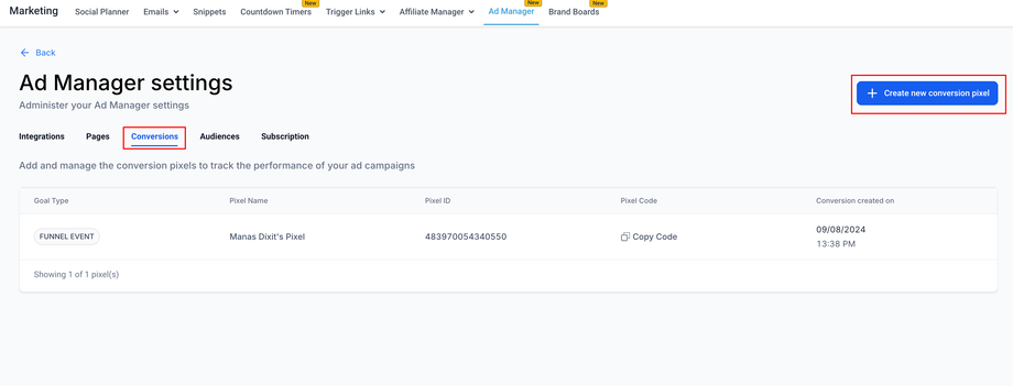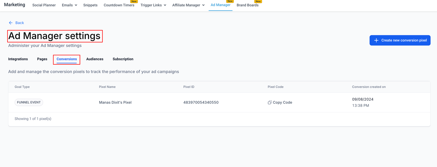 Unter dem Tab Conversions sehen Sie alle Pixel, die aus dem verbundenen Meta-Ad-Konto übernommen wurden, zusammen mit denjenigen, die im Ad Manager über die Schaltfläche „Create new conversion pixel“ erstellt wurden.