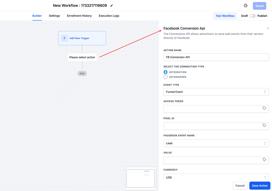 Wenn Sie einen Workflow mit dem Trigger „Facebook Form Submitted“ verwenden, enthält der Kontakt eine fbclid und der Workflow sendet die Daten an die Conversion API (CAPI).