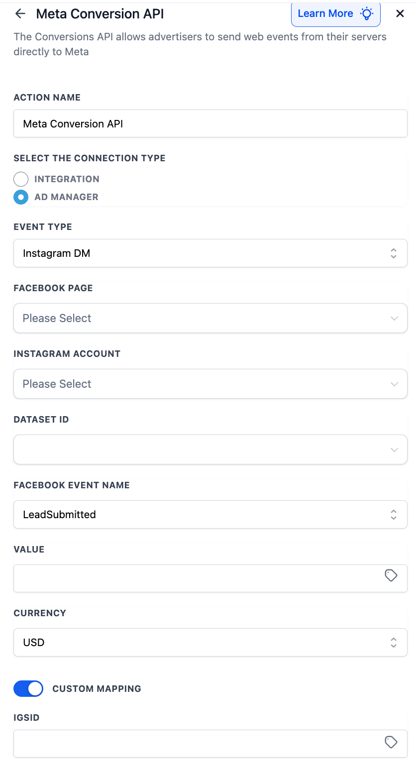 Für Instagram DM-Events in der Meta Conversion API-Aktion: