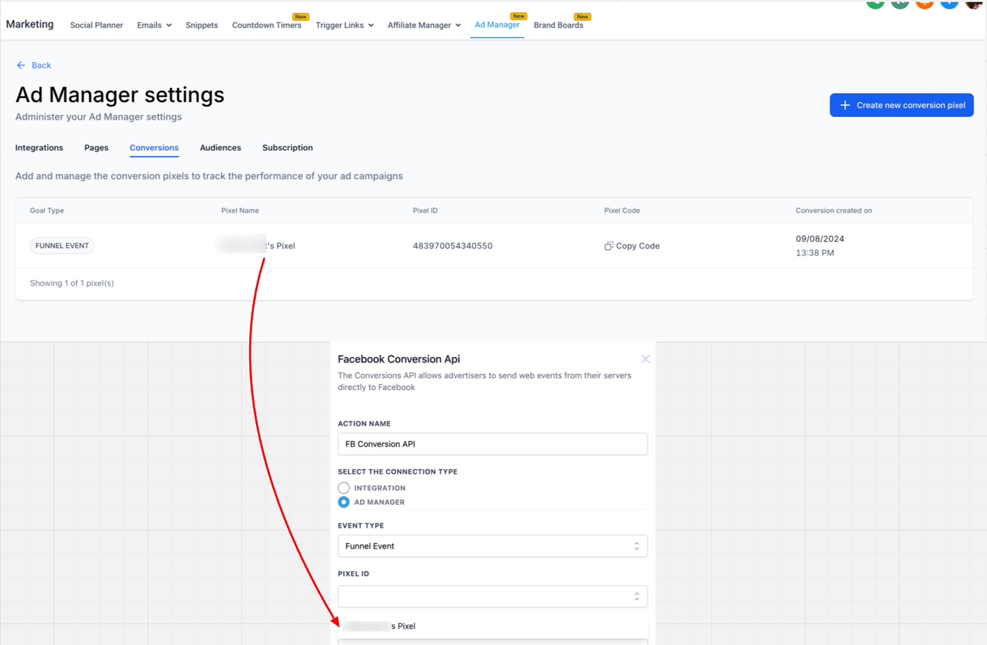 Alle Pixel, die Teil des Ad Managers sind, werden automatisch im Dropdown angezeigt, sodass Sie eines auswählen können. Dadurch entfällt das Kopieren/Einfügen der Pixel-ID aus Meta.