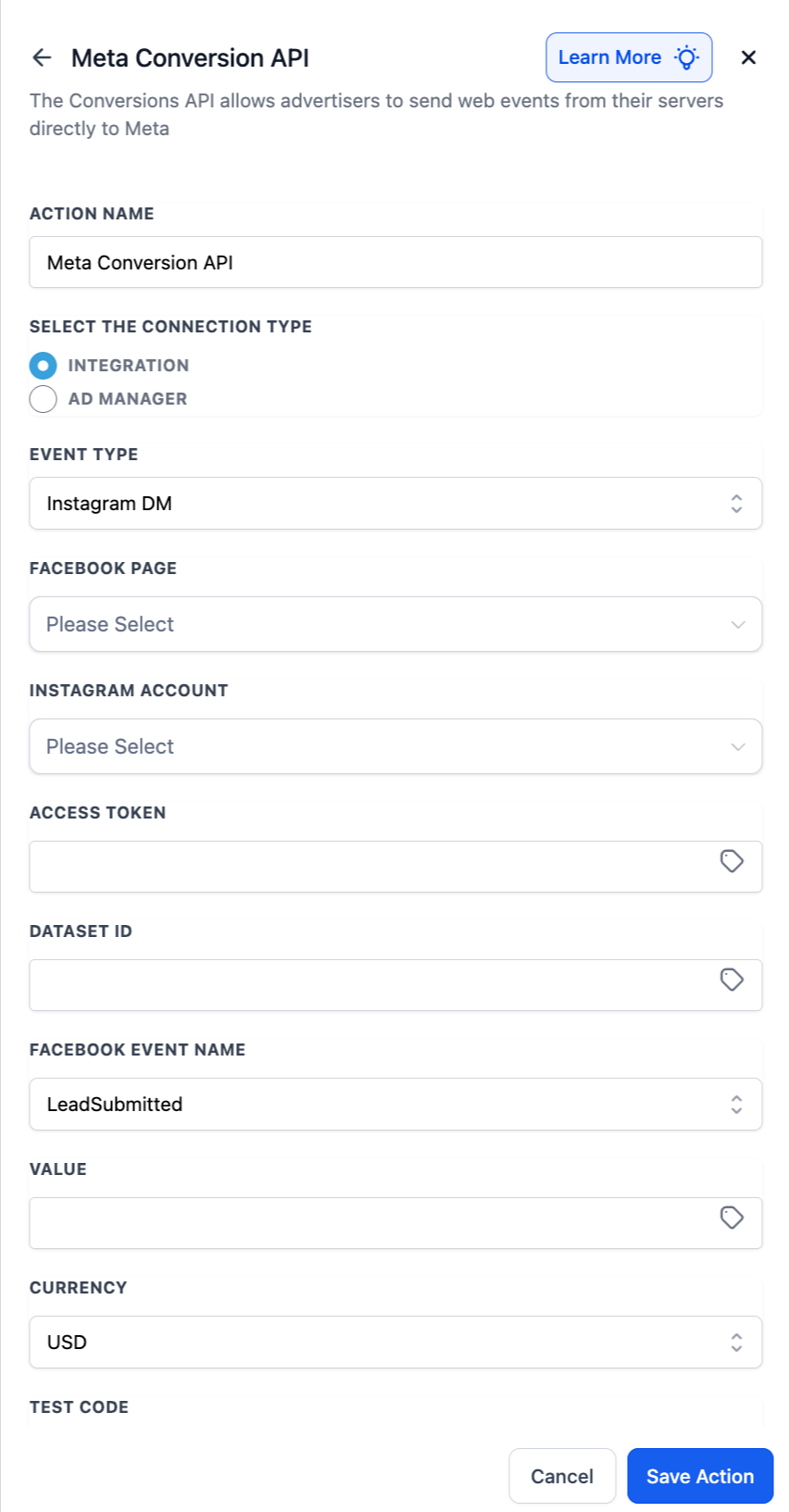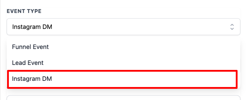 Sie können den Event-Typ basierend auf der Kampagne auswählen, für die Sie CAPI-Daten an Meta senden möchten.